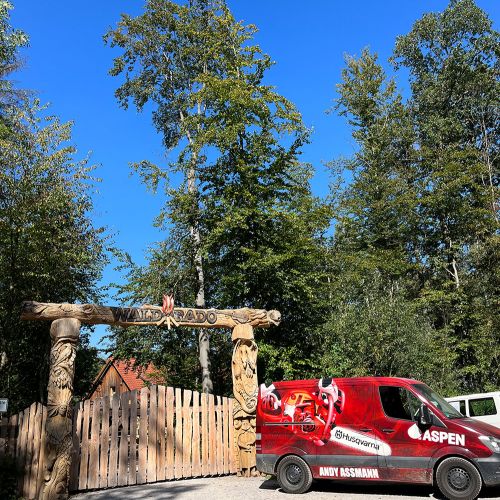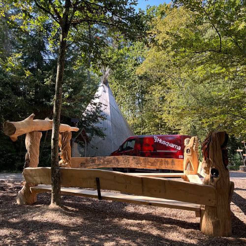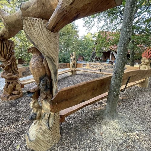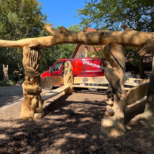 Eine gigantische Sitzgruppe, mit insgesamt 13 Laufmetern Sitzfläche inkl. Rückenlehne, wurde am Wochenende ab dem 01.09.2023 im Waldorado in Bad Mergentheim erstellt. Insgesamt enstanden 4 Stützpfosten die von mir und drei weiteren Künstler zu kunstvollen Säulen zum Thema Waldorado bearbeitet wurden. Diese dienen nun für Schulklassen zum Ankommen im Park und um gemütlich an einem Feuer in der Mitte Stockbrot zubereiten zu können.