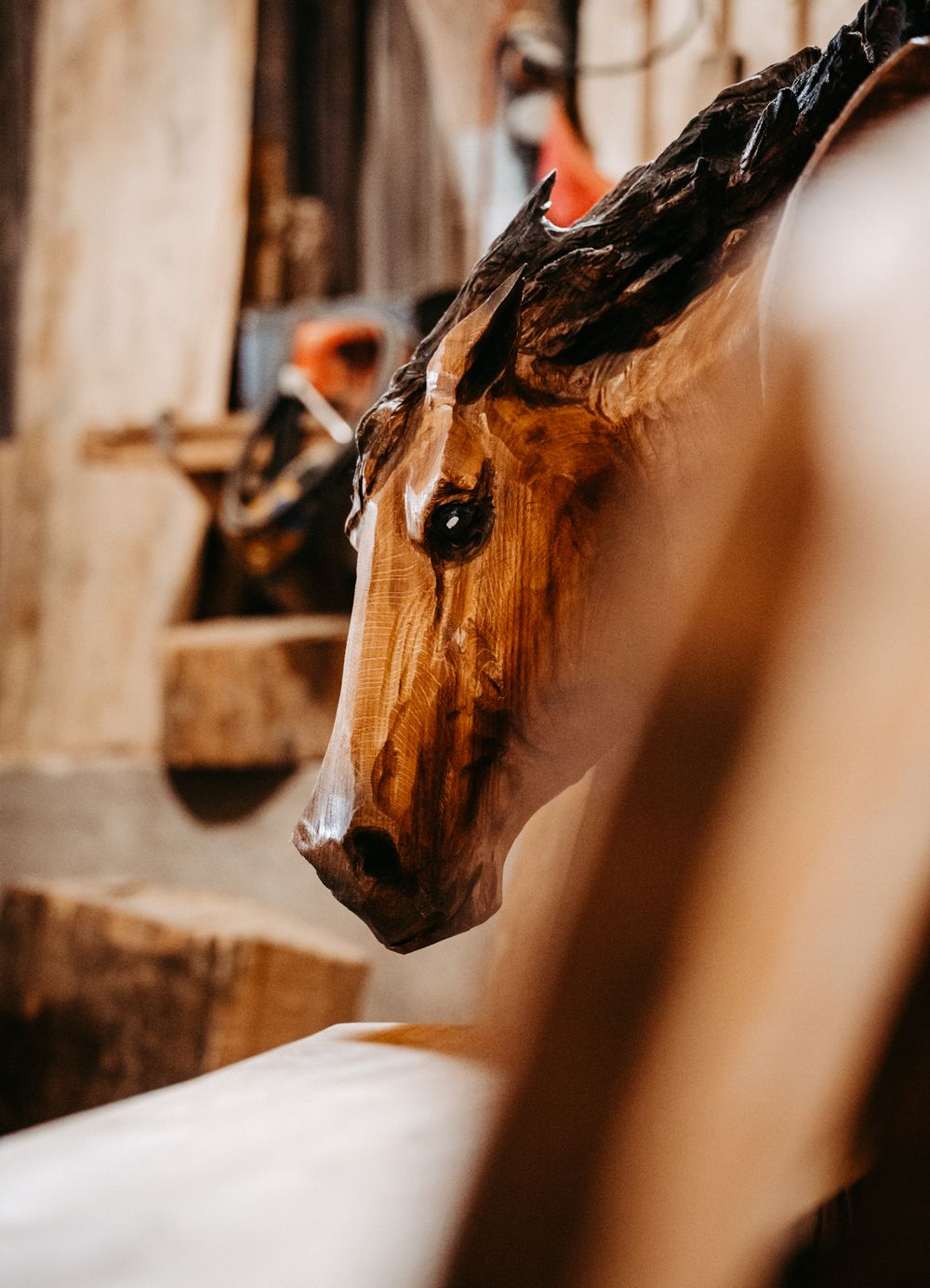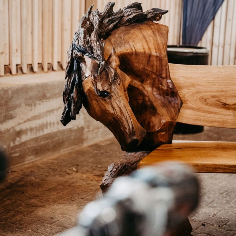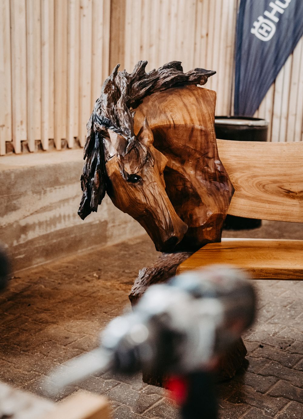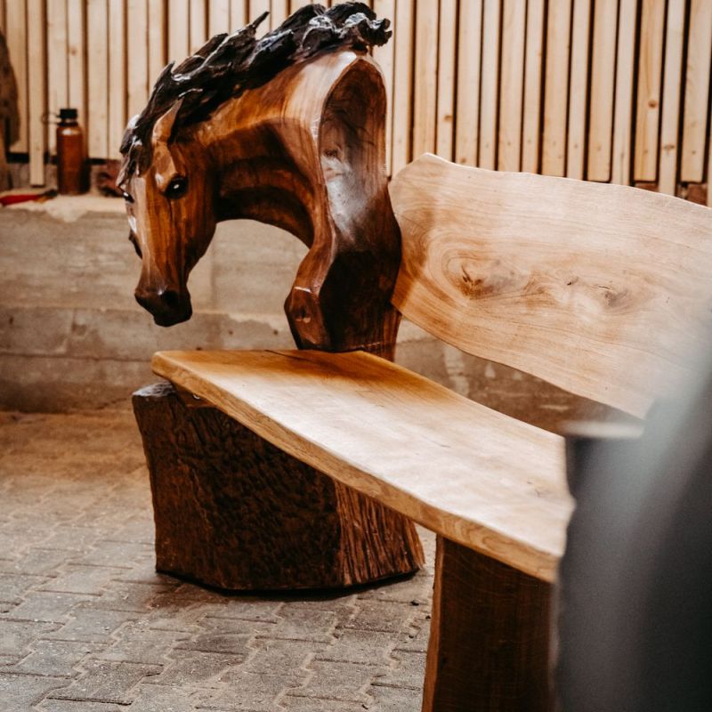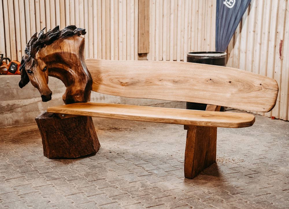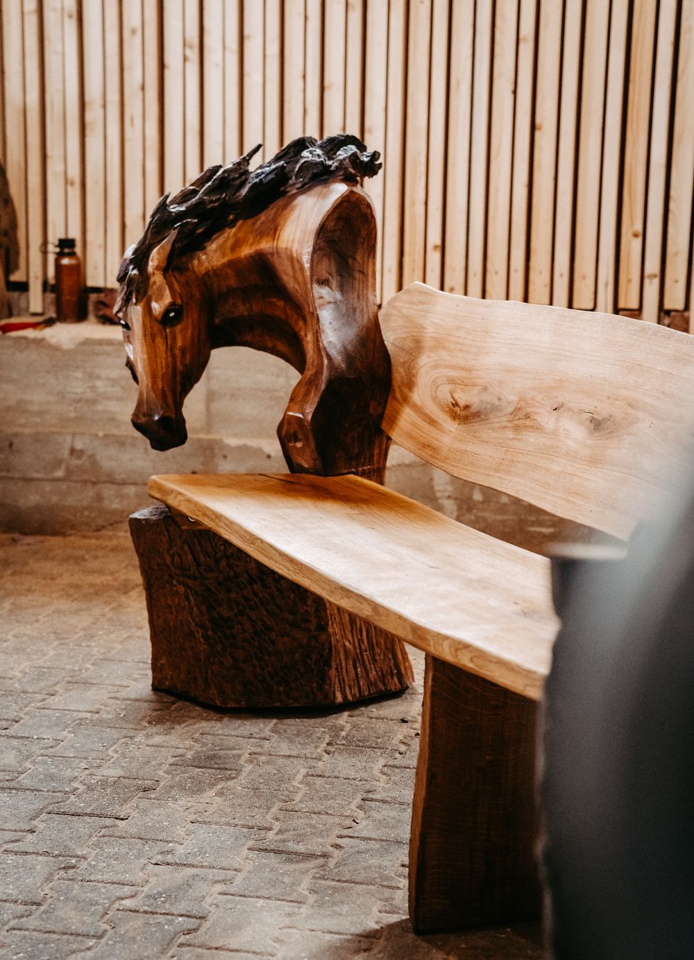 Für einen Pferdehof durfte ich diese extravagante und tolle Sitzgelegenheit erschaffen. Aus einem mächtigen ca. 80 cm dicken Eichen Stamm konnte die schöne Haltung des Kopfes geformt und heraus gearbeitet werden. Die Mähne zeigt die Wildheit des Kunstwerks und die Ohren sowie die Augen zeigen von Entschlossenheit mit der es im Leben steht. Denn auch der Betreiber des Gestüt geing mit Entschlossenheit in seinem Leben voran und baute einen wunderbaren Pferdehof auf.